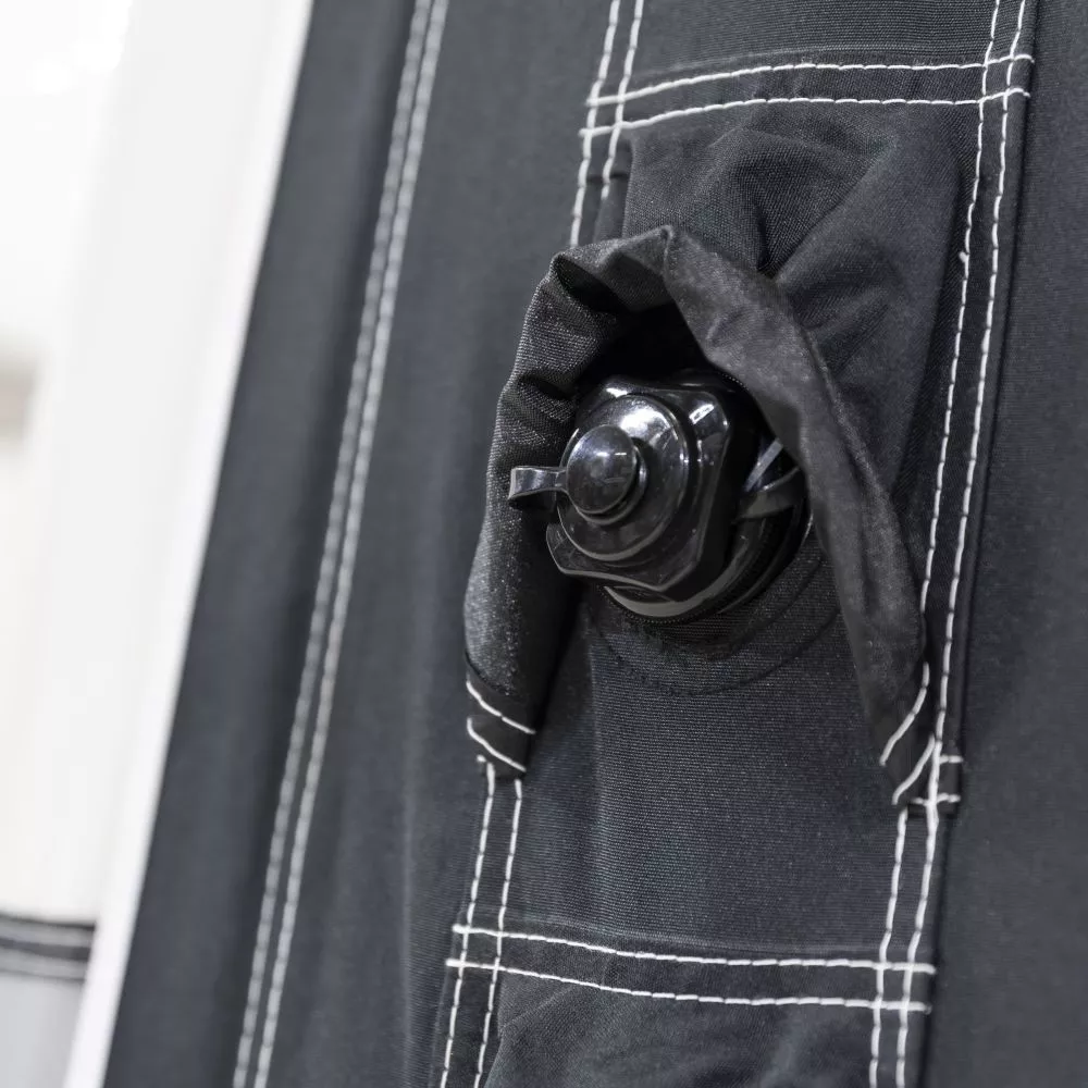 - Schliesse dann die mitgelieferte Handpumpe an den oberste Aufblaspunkt an und pumpe das Vorzelt so weit auf, bis die Luftschläuche voll ausgefüllt sind. Der ideale Aufblasdruck liegt bei 9 psi / 0,62 bar. Die miteinander verbundenen Luftschläuche ermöglichen einen äusserst schnellen Aufbau.