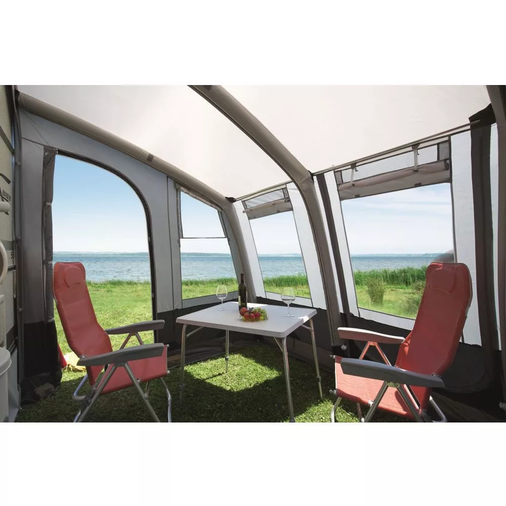 verfügt über ein hochrollbares Vorderwandelement, kann so als Sonnendach aufgestellt werden