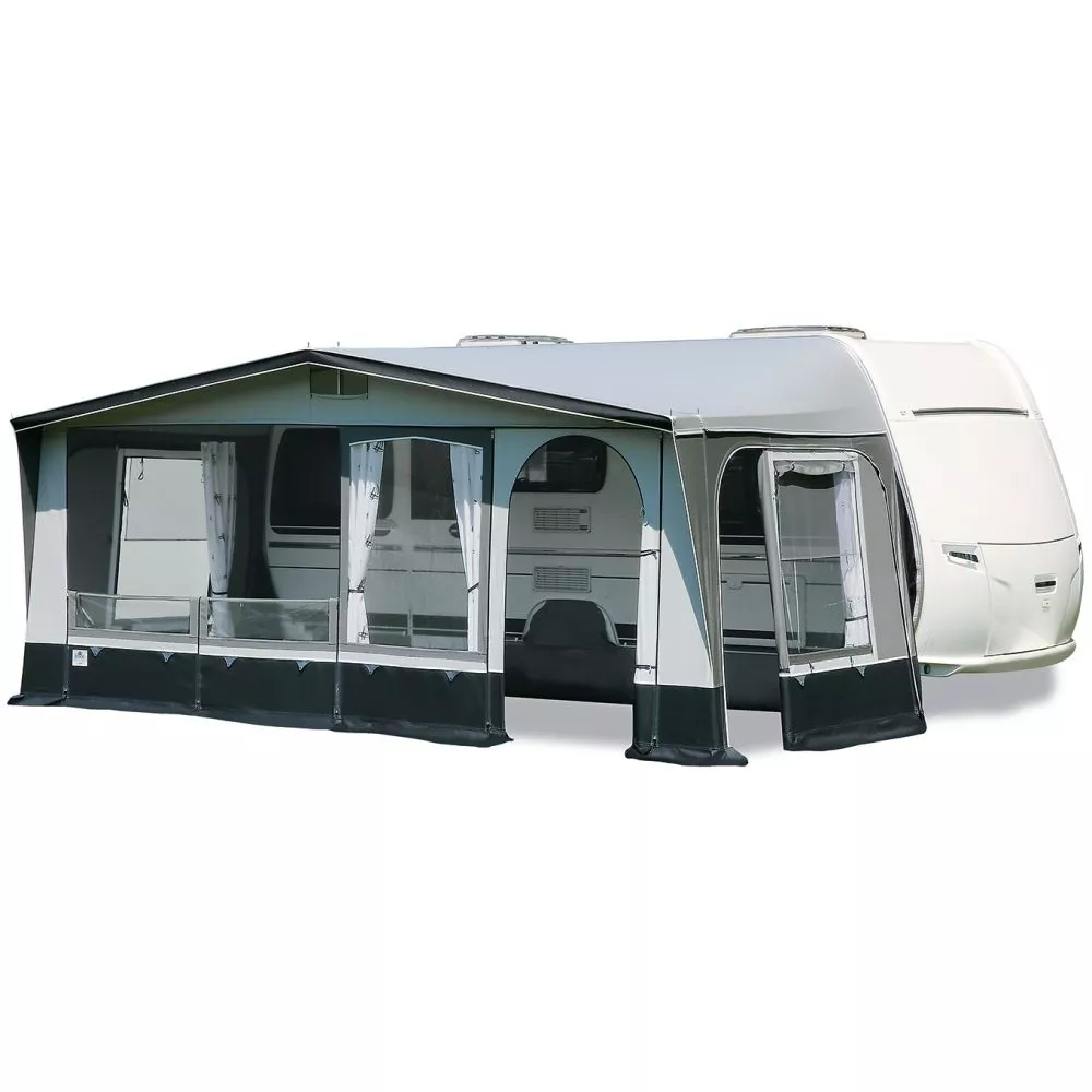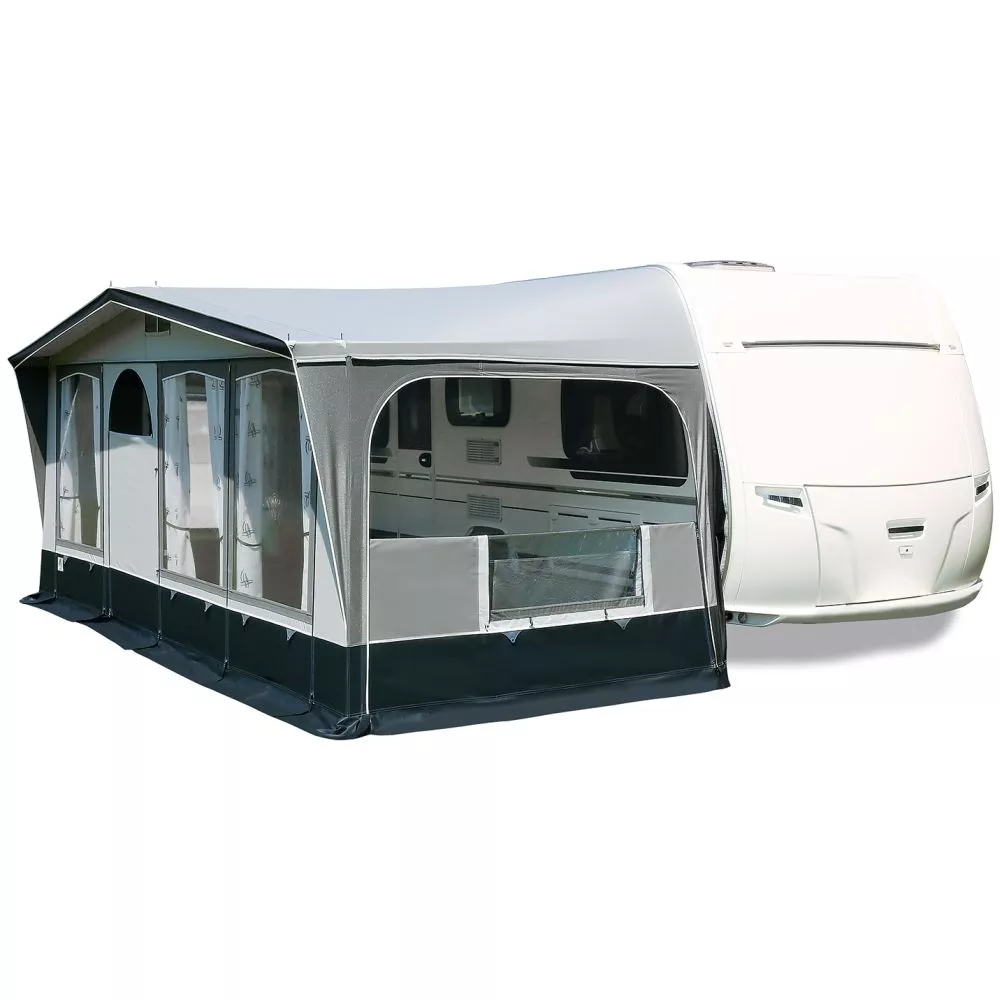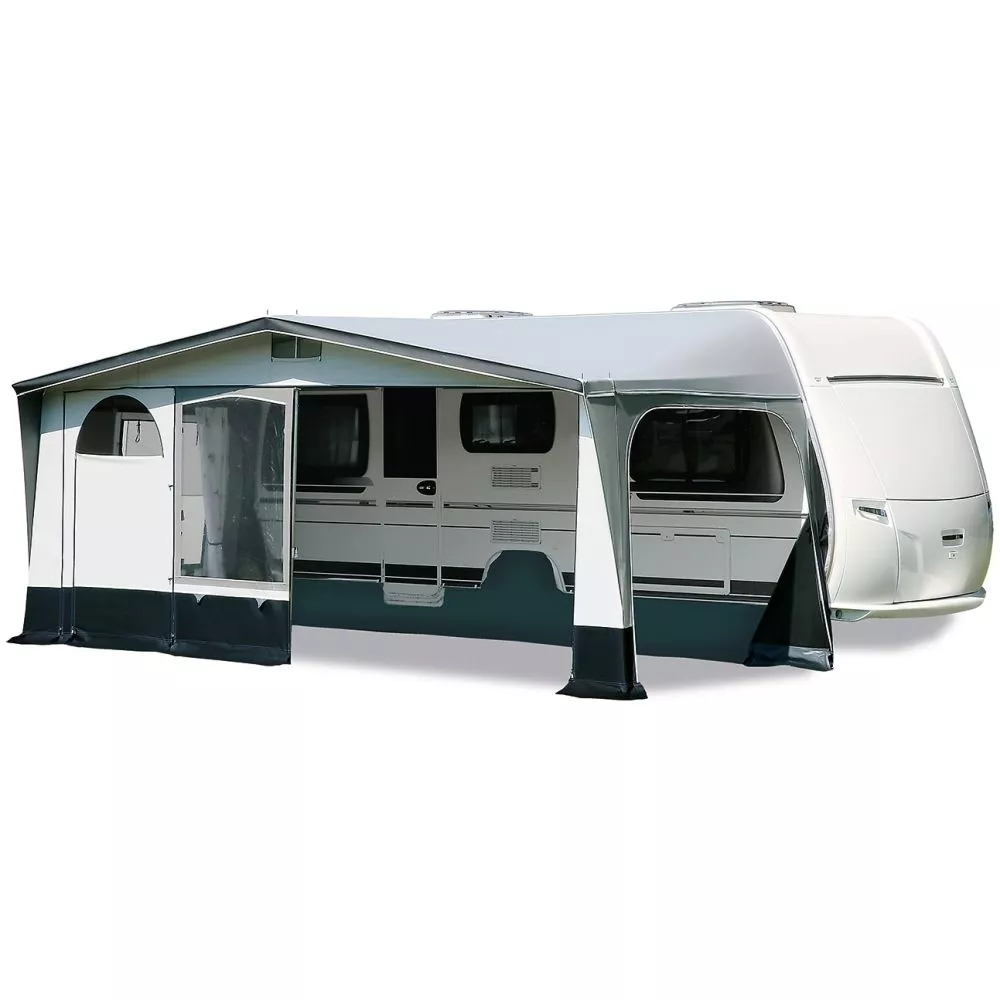 Dieses Caravanvorzelt ist bei Bedarf optional mit einem Vorzelt-Sonnendach erweiterbar. Damit schaffst du dir einen Schattenplatz und kannst deine Sitzgruppe ins Freie verlagern. Du benötigst weitere Schlafplätze oder Stauraum? Dann ist der als Zubehör erhältliche Erker bzw. Seitenanbau die Lösung.